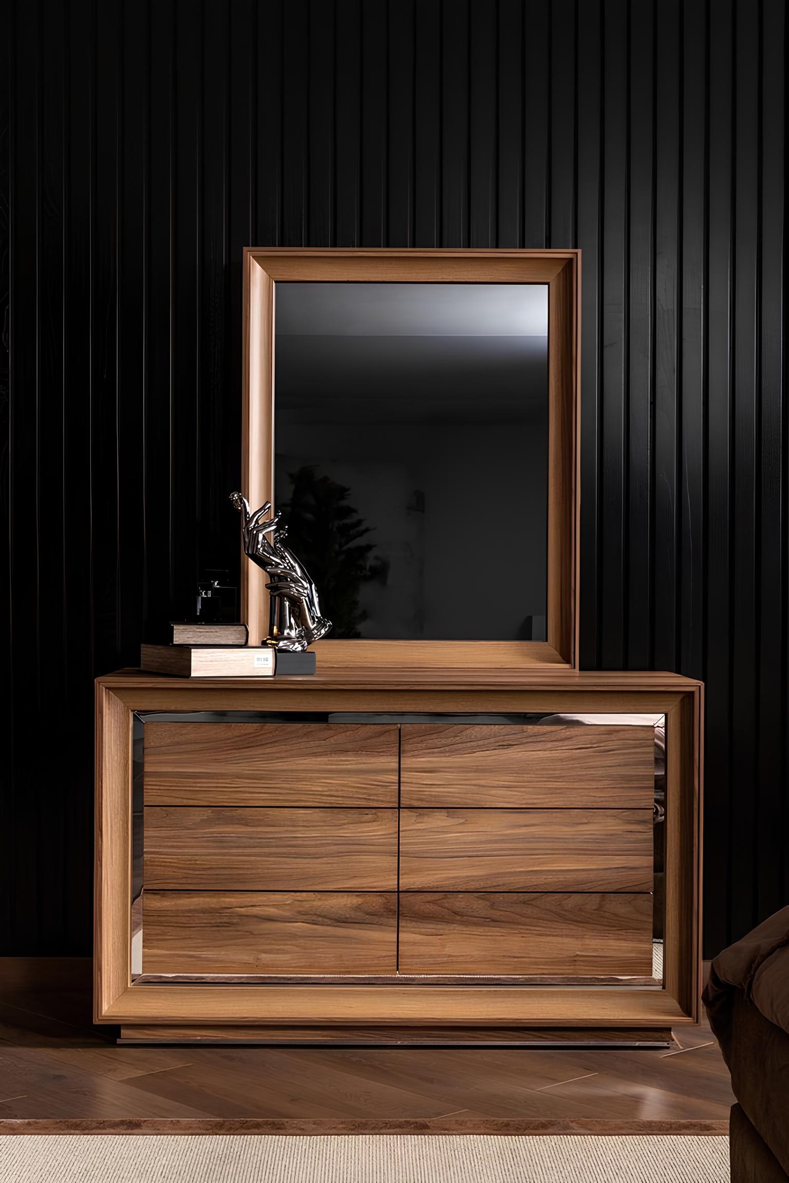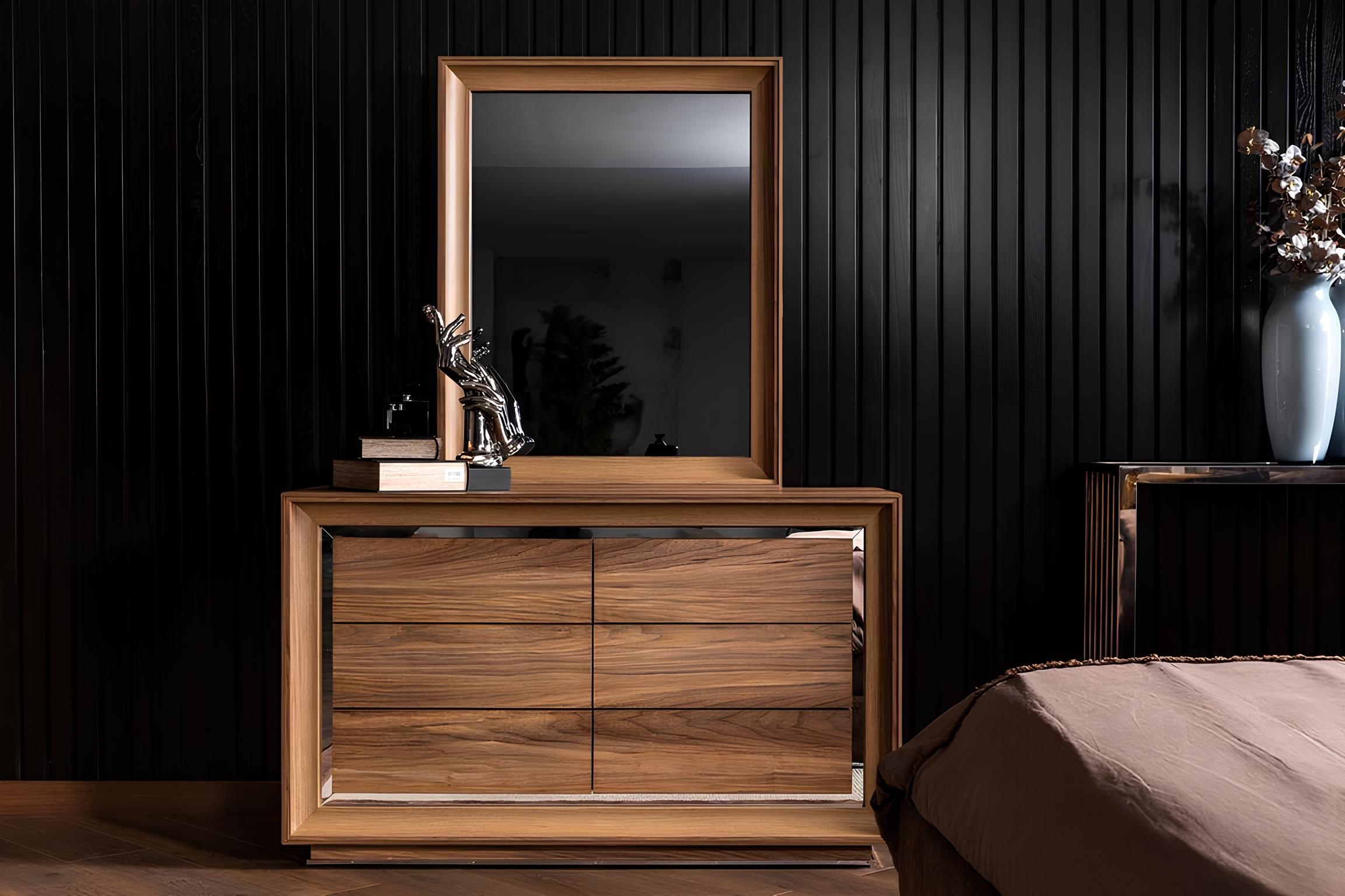 Oplev det fuldendte soveværelse med dette eksklusive 5-delers sæt, der inkluderer et stilrent skab, elegante natborde og en majestætisk seng. Hver komponent er omhyggeligt designet i en dyb, brun nuance, der tilfører rummet en varm og indbydende atmosfære. Materialerne er udvalgt med omtanke for kvalitet og holdbarhed, hvilket sikrer en luksuriøs oplevelse, der varer. Dette sæt er ikke blot møbler; det er en investering i en livsstil, hvor elegance og funktionalitet mødes. Giv dit hjem den sophistication, det fortjener, og oplev den eksklusive ambiance, som kun 20 års ekspertise i luksusmøbler kan tilbyde.