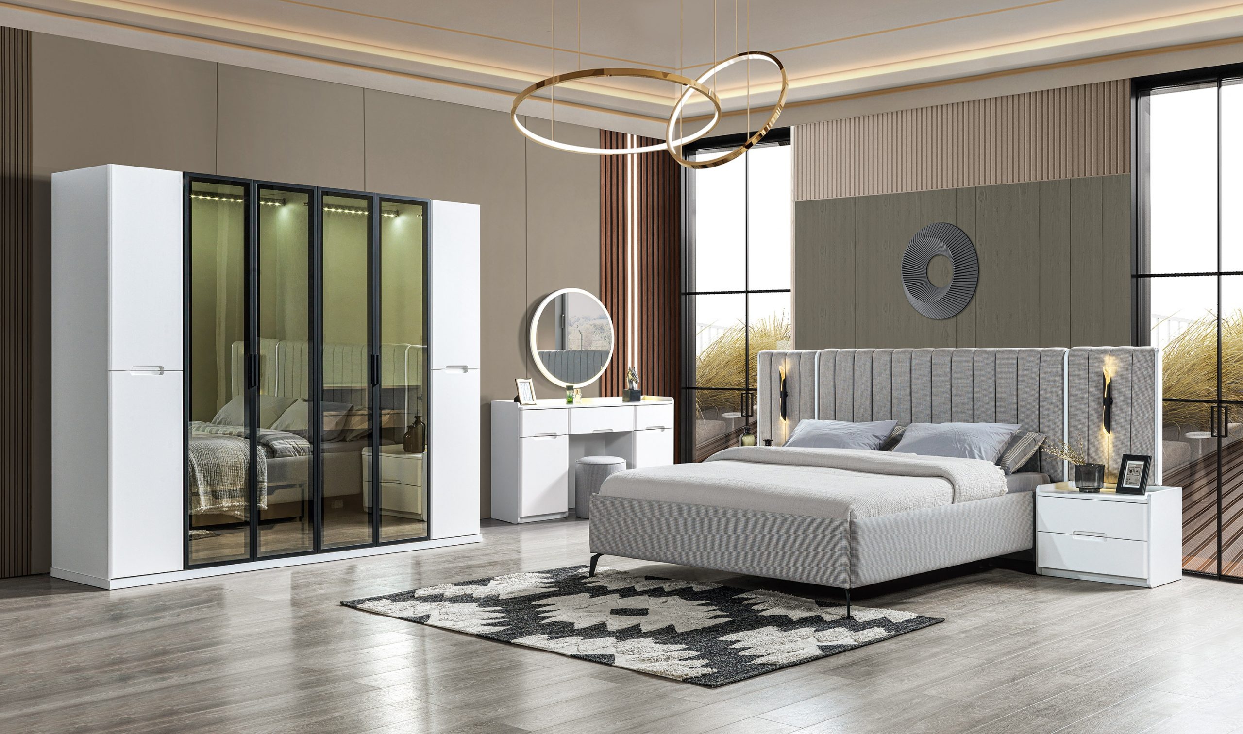 Oplev luksus med vores komplette soveværelsesensemble, der inkluderer en seng, skab og natborde, alt sammen i et stilrent design. Denne eksklusive samling i grå træ skaber en harmonisk atmosfære, der indbyder til ro og afslapning. Håndværket er uovertruffent, og hver detalje er omhyggeligt udformet for at sikre både funktionalitet og æstetik. Ensemblets tidløse elegance afspejler en livsstil præget af raffinement og kvalitet. Med over 20 års erfaring i at tilbyde luksusmøbler, repræsenterer dette soveværelsesensemble det ypperste inden for design og komfort, og det vil uden tvivl forvandle dit hjem til et eksklusivt fristed.