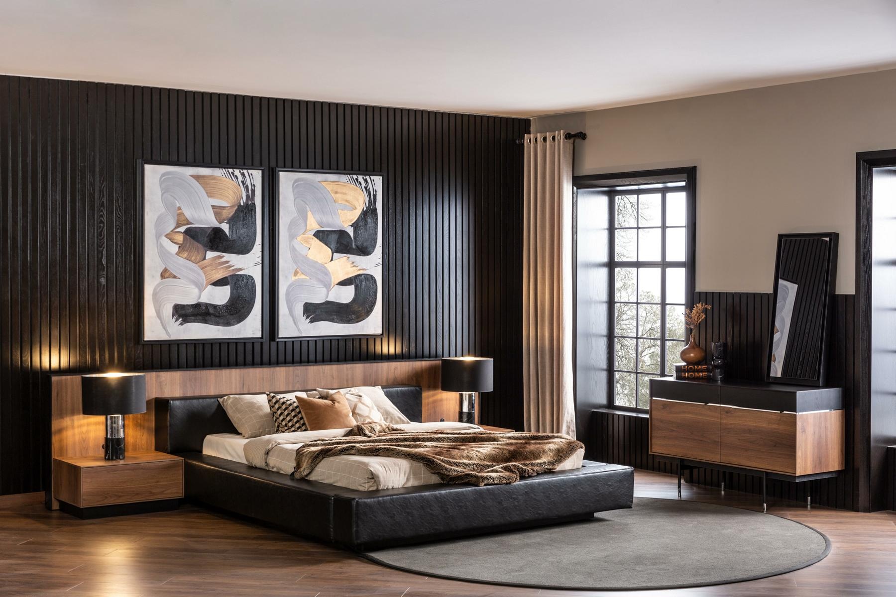 Oplev det ultimative i luksus med vores soveværelsesmøbel sæt i fem dele. Dette enestående sæt, der omfatter en seng, natborde og kommode, er skabt til at forvandle dit soveværelse til et fristed for elegance og stil. Den dybe sort finish fremhæver den tidløse skønhed i det gedigne design og giver et sofistikeret touch til ethvert rum. Hvert element er omhyggeligt konstrueret med fokus på kvalitet og æstetik, hvilket sikrer en harmonisk balance mellem funktionalitet og skønhed. Vælg dette sæt for at udtrykke din unikke smag og livsstil. Med over 20 års erfaring i luksusmøbler er vi dedikeret til at tilbyde en eksklusiv atmosfære, der skaber uforglemmelige øjeblikke.
