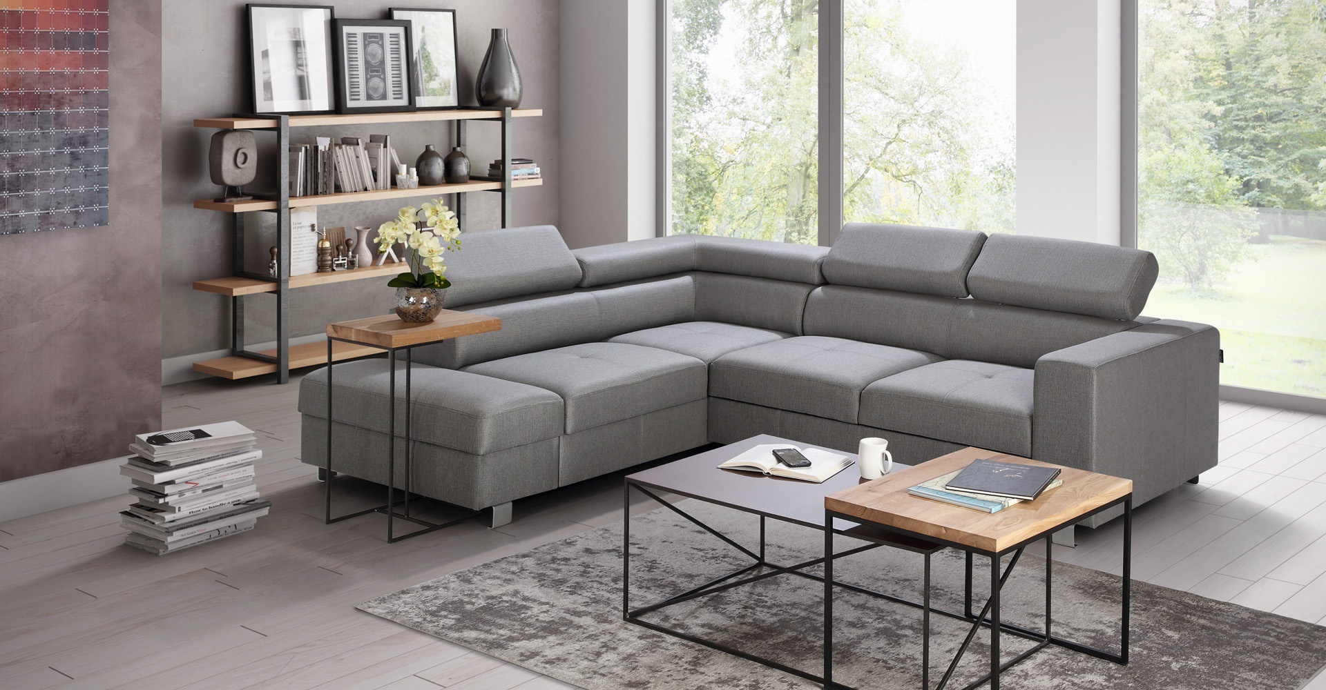 Grå hjørnesofa med sovefunktion, moderne L-design
