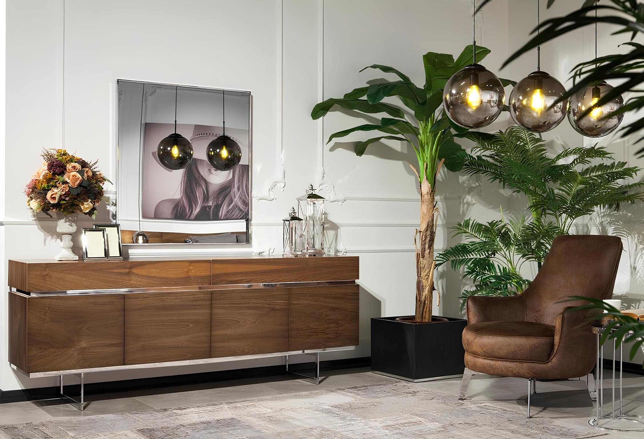 Oplev en uovertruffen elegance med vores spisebord med fire stole med armlæn, kommode og spejl i brun polyester. Dette ensemble forener tidløs skønhed med en moderne æstetik, hvilket skaber en perfekt ramme for uforglemmelige middage og hyggelige stunder. Hver stol er omhyggeligt designet med komfort i fokus, mens kommodens funktionalitet komplementerer den visuelle harmoni. Det præcise håndværk og de luksuriøse materialer afspejler et liv i stil og raffinement. Med over 20 års erfaring i luksusmøbler tilbyder vi dette sæt som en ideel investering i et eksklusivt hjem, hvor skønhed og funktionalitet forenes i perfekt balance.