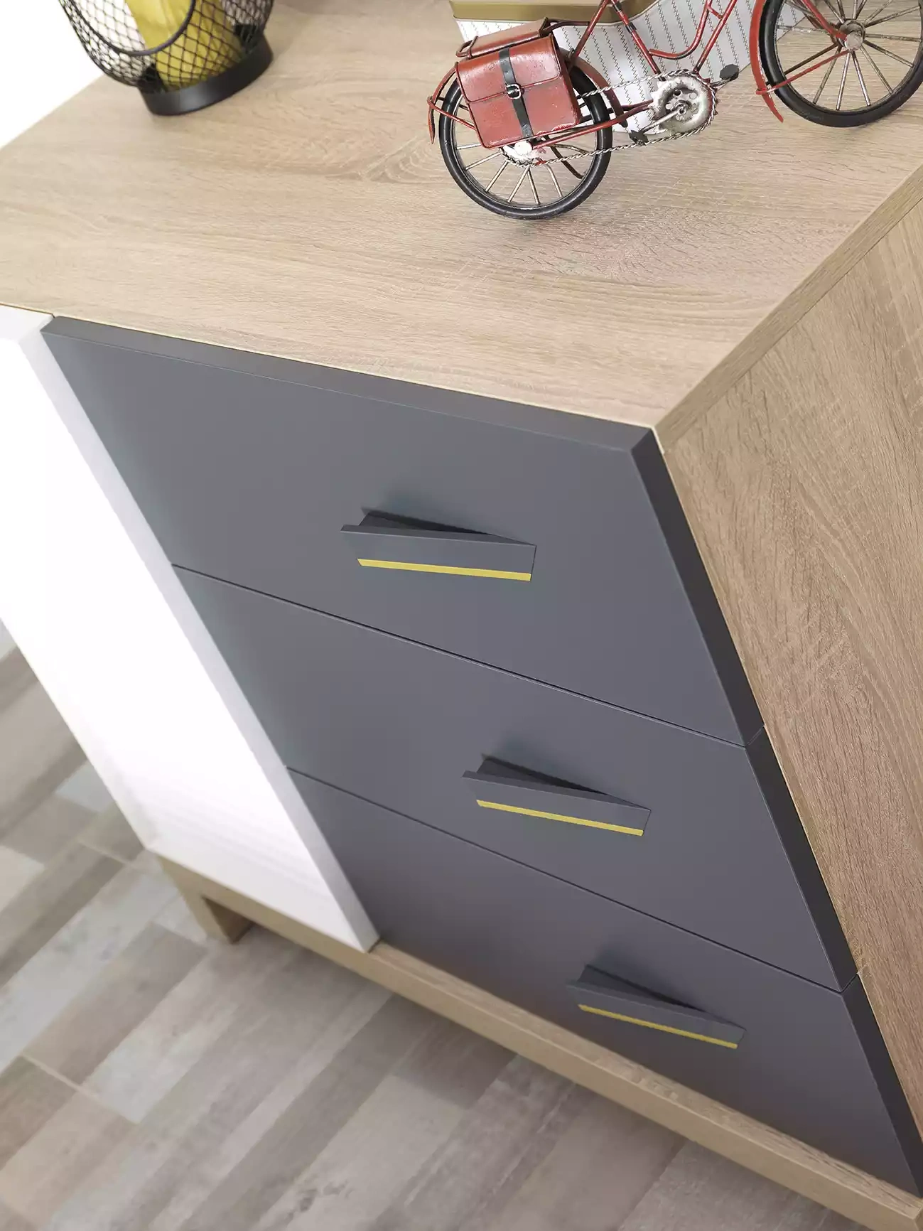 Denne moderne kommode til børn er en perfekt fusion af funktionalitet og elegance, designet til at berige børneværelset med sit stilfulde udtryk. Den grå nuance tilføjer et subtilt, men alligevel sofistikeret præg, der harmonerer med ethvert interiør. Fremstillet af førsteklasses materialer, sikrer kommoden både holdbarhed og tidløs skønhed. De rummelige hylder tilbyder optimal opbevaringsplads, hvilket gør det nemt at organisere legetøj og tøj. Med 20 års erfaring i luksusmøbelbranchen repræsenterer denne kommode et valg, der ikke blot er praktisk, men også en investering i en eksklusiv livsstil. Giv dit barn et værelse, der stråler af kvalitet og stil.