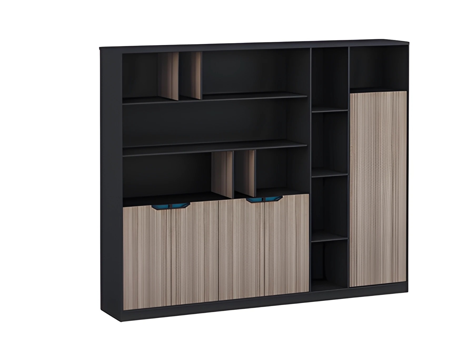 Vægmonteret kontorskab i brun-sort træ med moderne blå døre | xxlmobler.dk