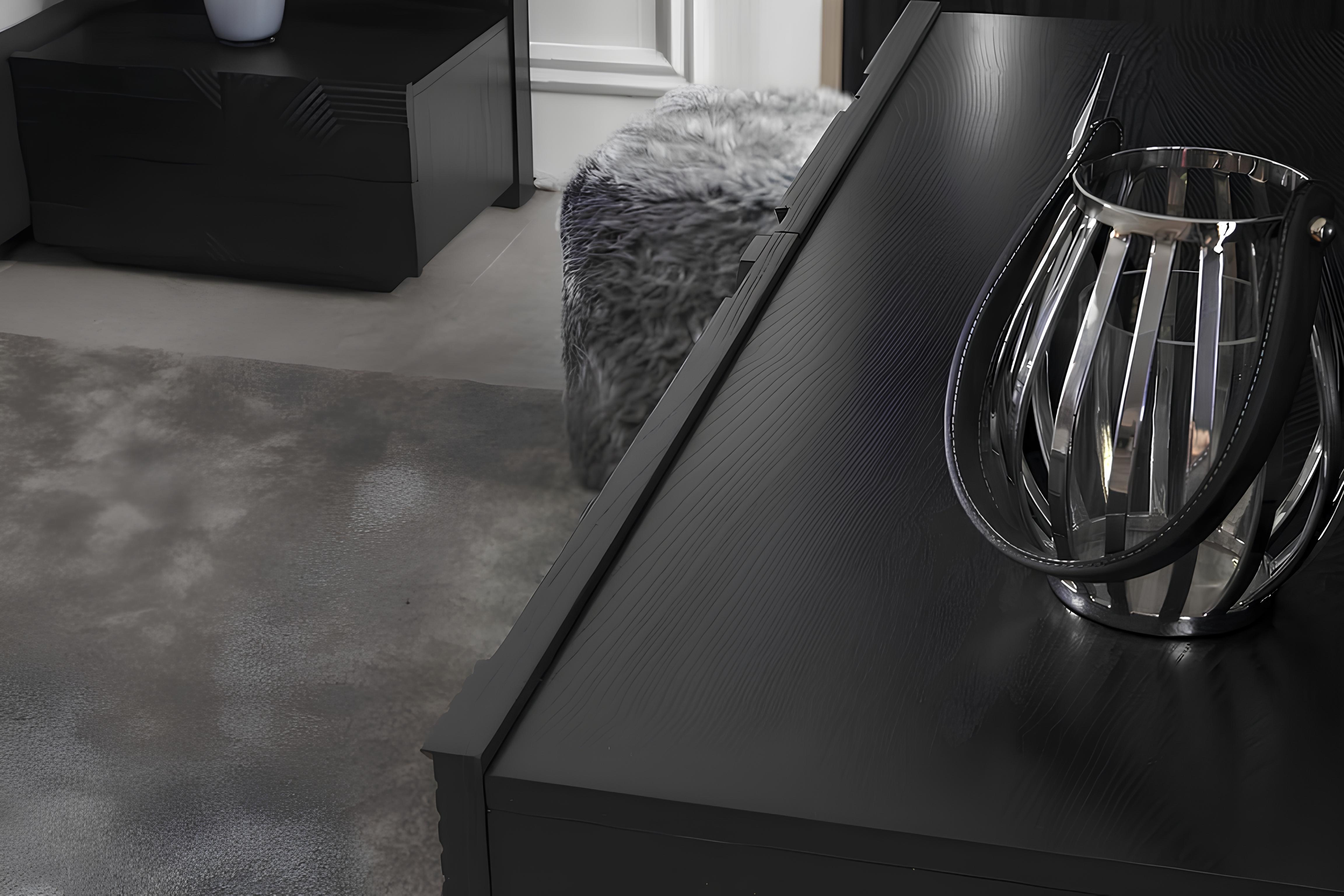 Oplev essensen af raffinement med vores luksuriøse soveværelseskollektion, bestående af et skab, en kommode og to natborde. Denne eksklusive suite i sort polyester forener tidløs elegance med moderne funktionalitet, hvilket skaber et imponerende og harmonisk rum. Hvert element er omhyggeligt designet til at tilbyde både stil og praktisk anvendelighed, hvilket gør det til den ideelle løsning for den kræsne indretningsentusiast. Den dybe sorte farve tilføjer en sofistikeret dybde, mens de rene linjer og glatte overflader udstråler klasse. Med 20 års erfaring inden for luksusmøbler er dette soveværelse ikke blot en investering i kvalitet, men en erklæring om en eksklusiv livsstil.