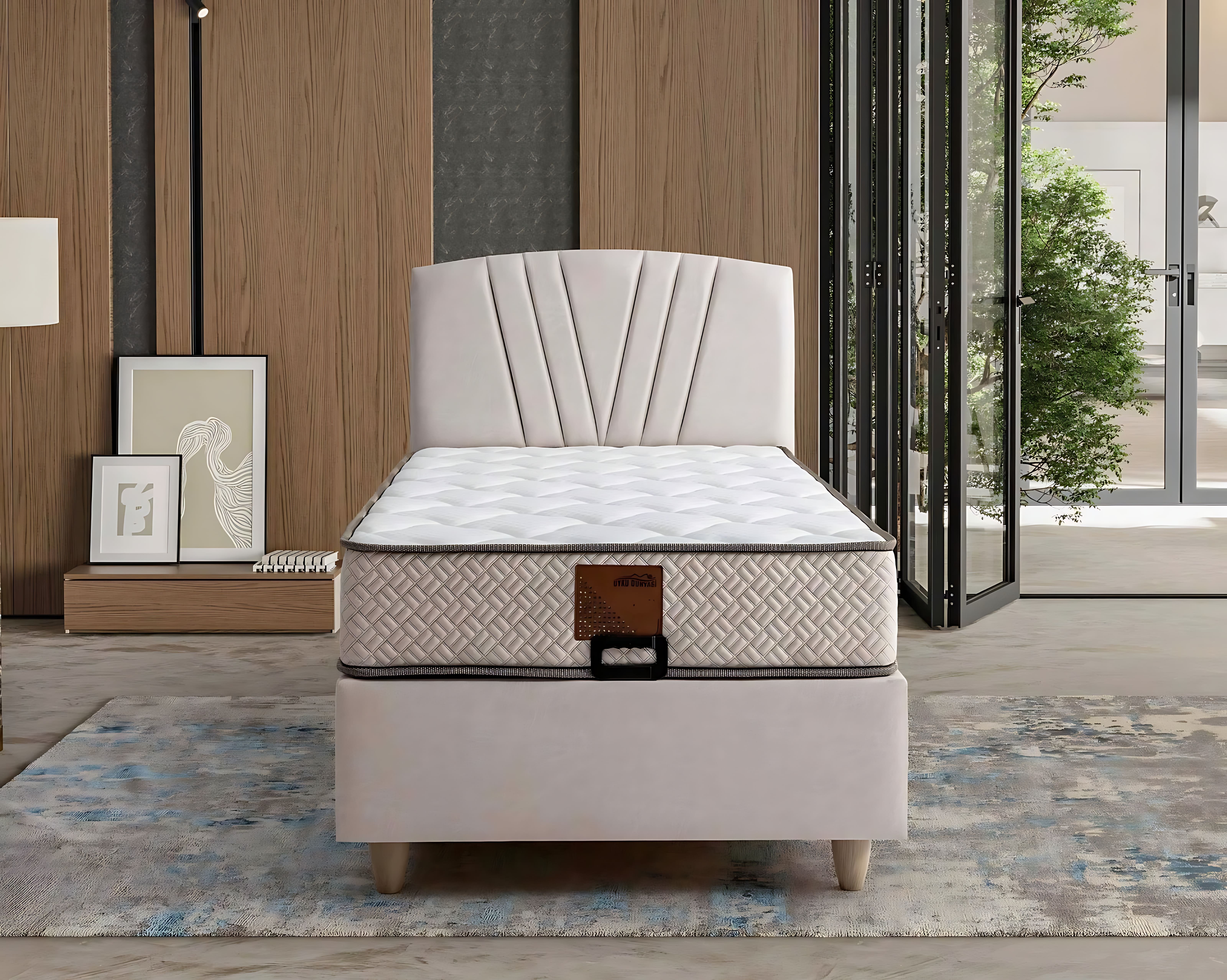 Elegant seng med madras i beige materiale