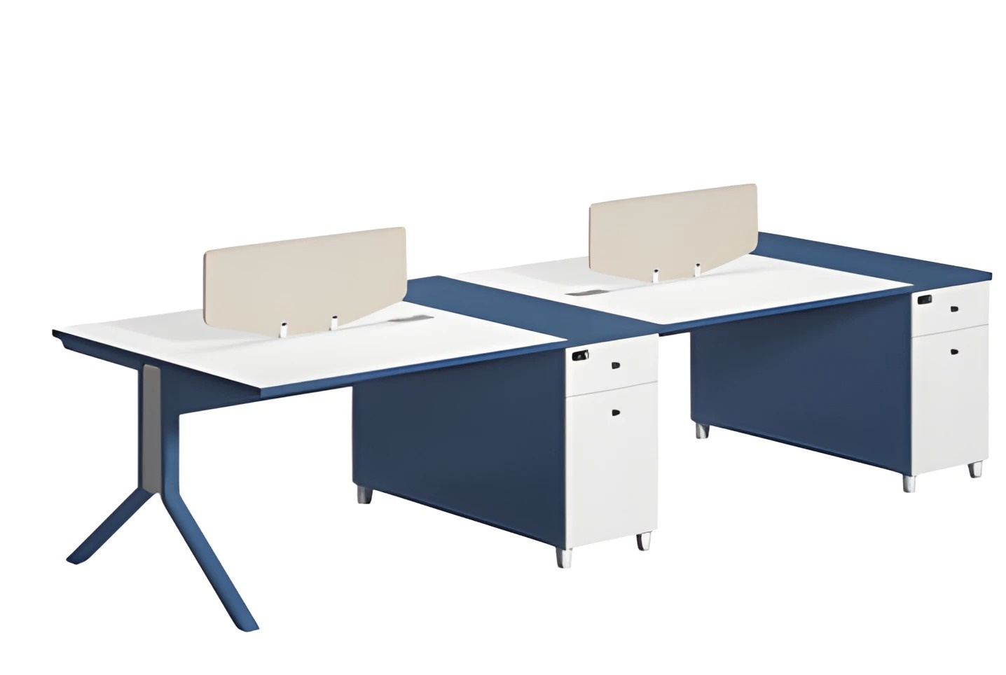 Blå og hvidt dobbelt skrivebord med moderne skillevæg til kontor