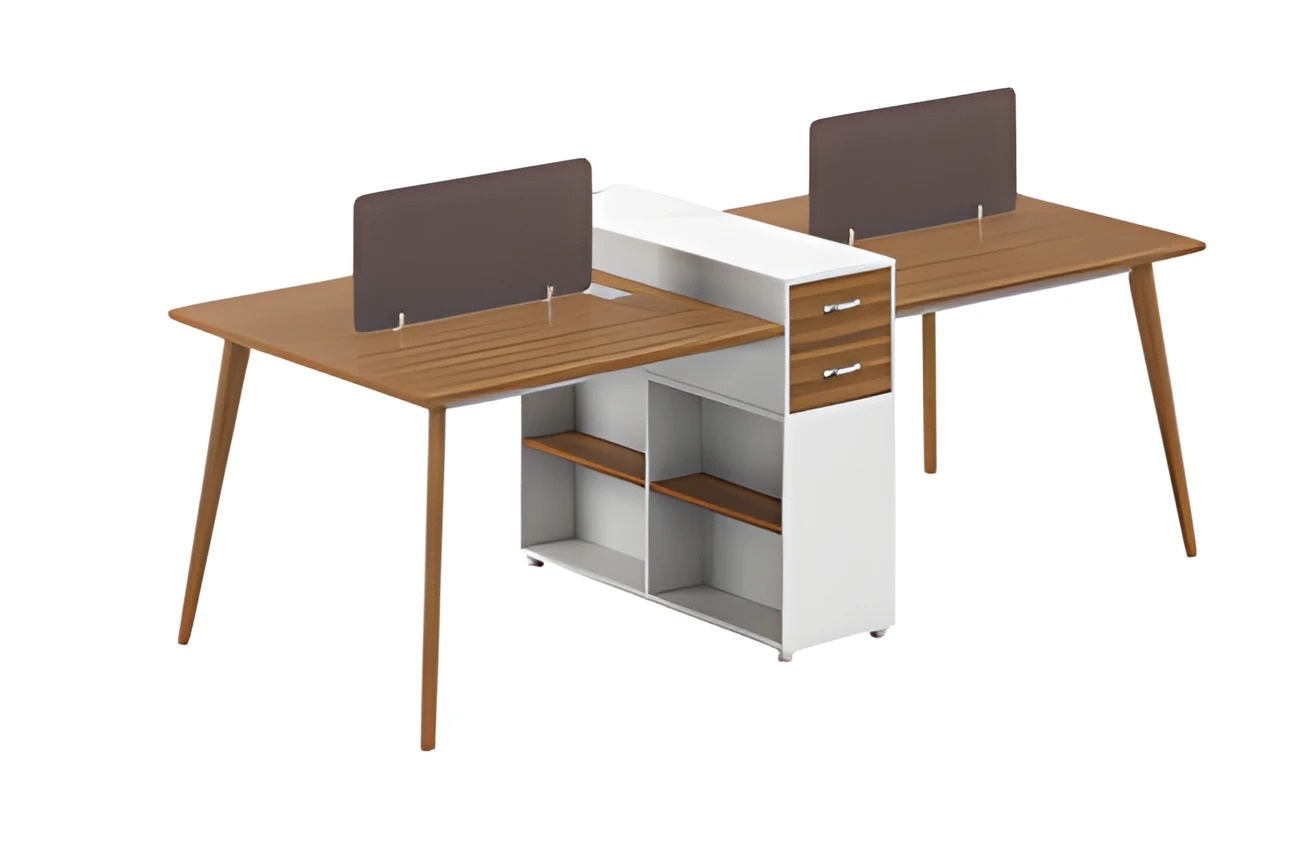 Moderne bord med hylde i træ og enkel skillevæg til kontor