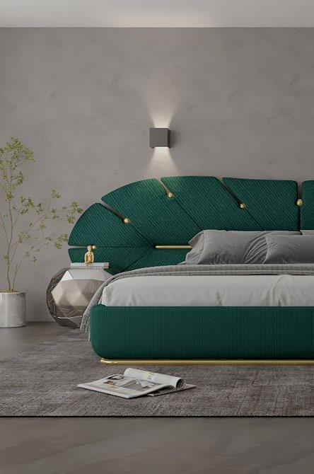 Oplev den luksuriøse grønne seng, der forener moderne design med tidløs elegance. Betrukket med det fineste grønne stof, tilføjer den en sofistikeret dybde til dit soveværelse, mens de gyldne vifteformede accenter skaber et smukt komplement til det overordnede udtryk. Denne seng er ikke blot et møbel, men et statement om en eksklusiv livsstil. Den nøje overvejede form og de udsøgte materialer udstråler kvalitet og stil, perfekt til den, der ønsker at transformere sit hjem til et fristed af raffinement. Giv dit rum en berøring af luksus med dette enestående design, der vil fortrylle enhver, der træder ind.