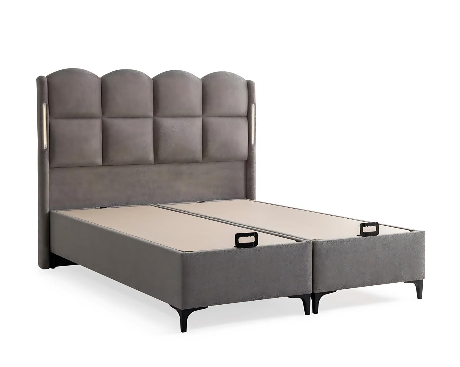 Grå seng med madras af tekstil og træ, moderne design | xxlmobler.dk