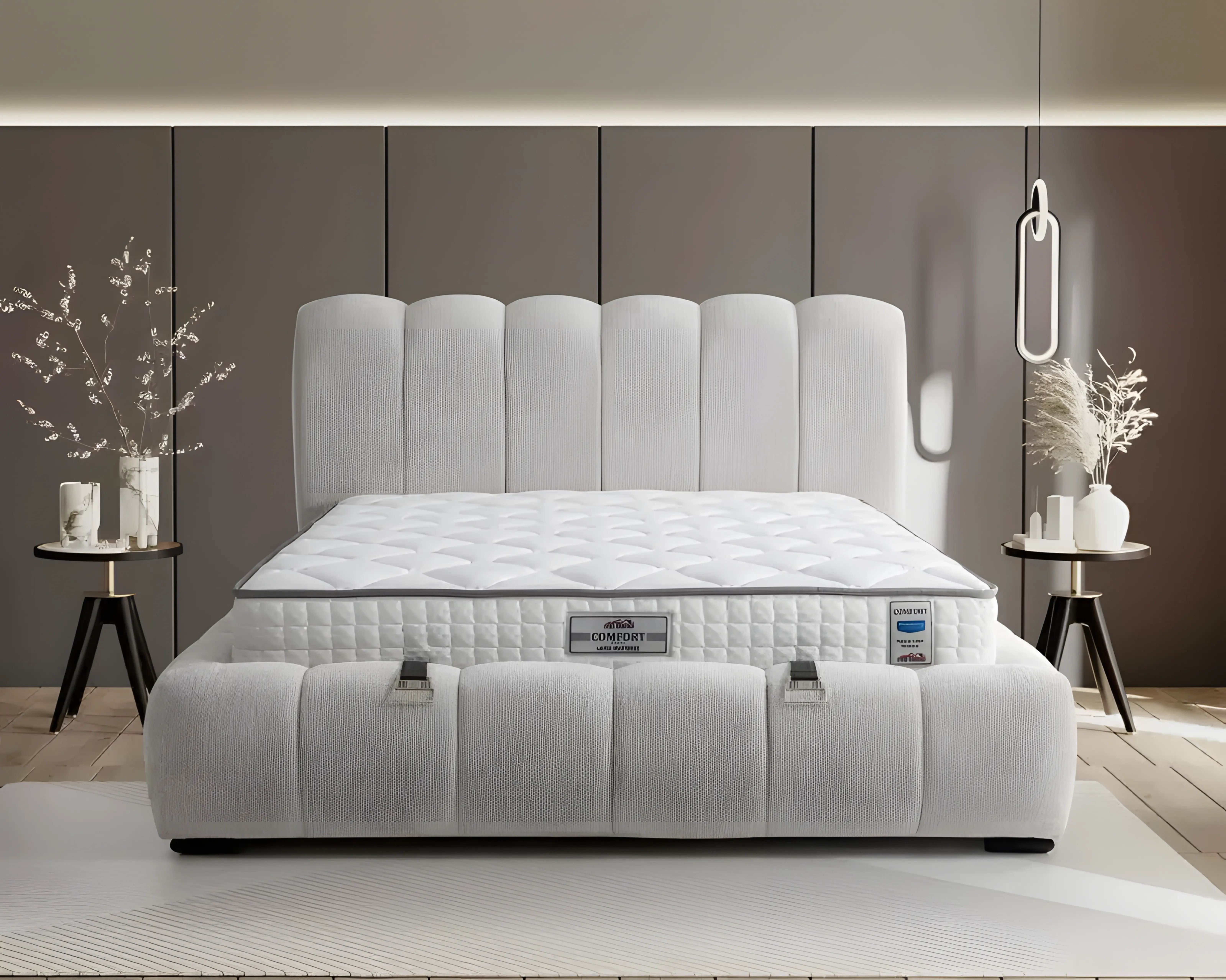 Hvid moderne tekstil seng med kvalitetsmadras | xxlmobler.dk