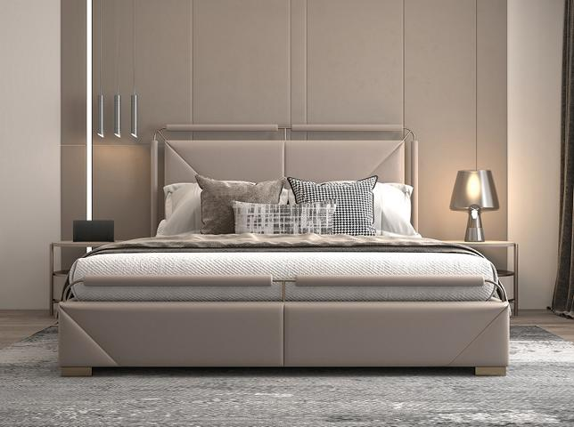 Luksus seng med moderne design i beige med gyldne accenter og en elegant hovedgærde