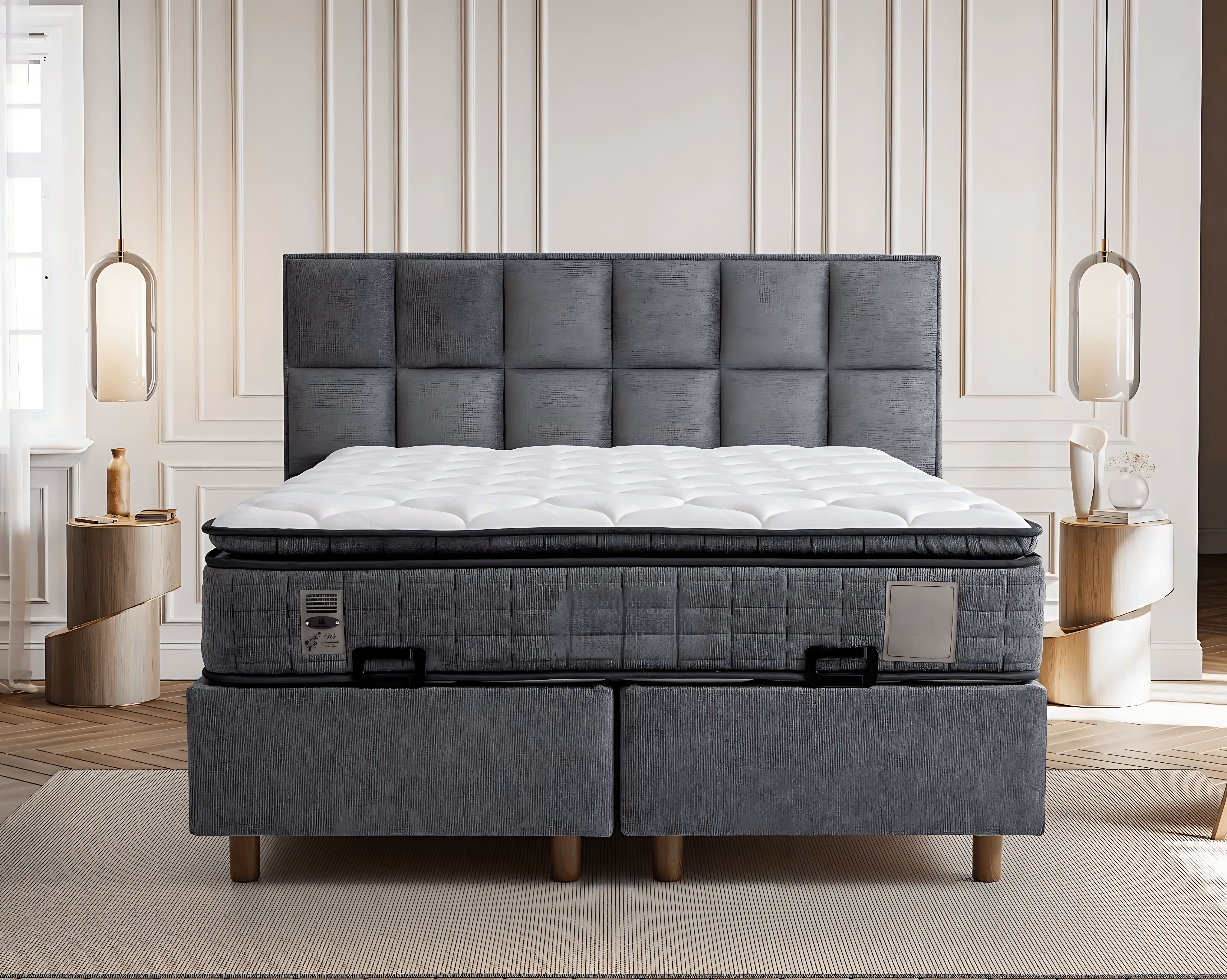 Den moderne grå seng med tekstilmadras og træ er et symbol på tidløs elegance og uovertruffen komfort. Det grå træ, der omfavner madrassen, tilføjer en subtil dybde og skaber en harmonisk balance i ethvert soveværelse. Denne seng er ikke blot et møbel, men en investering i en eksklusiv livsstil, der indkapsler skønheden af velovervejet design og håndværk. Med sin strømlinede form og luksuriøse materialer, tilbyder den en uovertruffen søvnoplevelse og forvandler dit hjem til et fristed for stil og ro. Vælg denne seng for at berige dit hjem med 20 års erfaring inden for luksusmøbler og en vidunderlig atmosfære.
